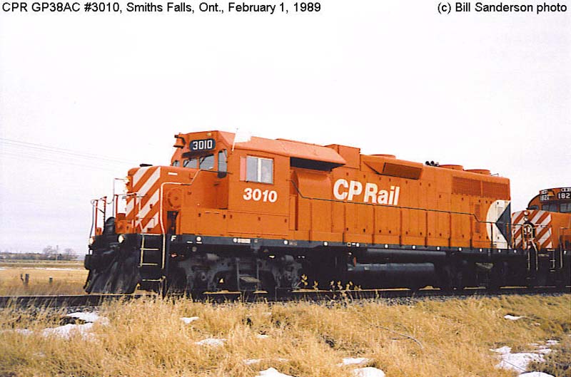 Other Photos (chronological) : 1. CP 3010 at Alyth, Calgary AB., painted in the CP Rail Large Multimark paint scheme. Photo by D.R. Phillips, 1972. From the Bill Sanderson collection; 2. CP 3010 at Smiths Falls, ON., painted in the CP Rail Small Multimark paint scheme. Photo by Bill Sanderson,1989; 3. CP 3010 at Port Coquitlam, B.C., painted in the CP Rail no-Multimark paint scheme. Photo by Bill Sanderson, 2001; 4. CP 3010 at Winnipeg, MB., painted in the Canadian Pacific paint scheme. Photo by A. Ross Harrison, 2014; 5. CP 3010 at Winnipeg, MB., painted in the Canadian Pacific paint scheme. Photo by A. Ross Harrison, 2014.