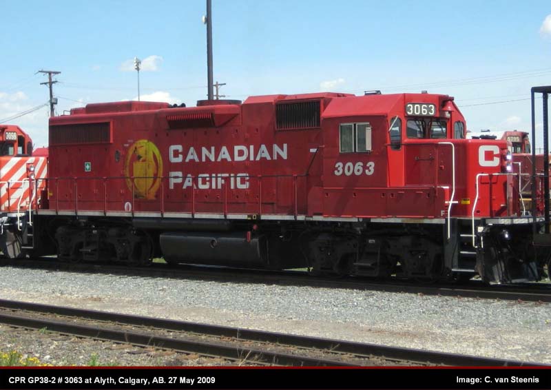 Other Photos (chronological) : 1. CP 3063 at Alyth, Calgary AB., painted in the CPR Beaver paint scheme. Photo by Cor van Steenis, 2009; 2. CP 3063 at Winnipeg, MB., painted in the CPR Beaver paint scheme. Photo by A. Ross Harrison, 2012; 3. CP 3063 at Winnipeg, MB., painted in the CPR Beaver paint scheme. Photo by A. Ross Harrison, 2018; 4. CP 3063 at Winnipeg, MB., painted in the CPR Beaver paint scheme. Photo by A. Ross Harrison, 2018.