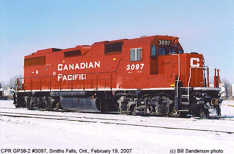 Other Photos (chronological) : 1. CP 3097 at Smiths Falls, ON., painted in the CP Rail Small Multimark paint scheme. Photo by Bill Sanderson, 1992.