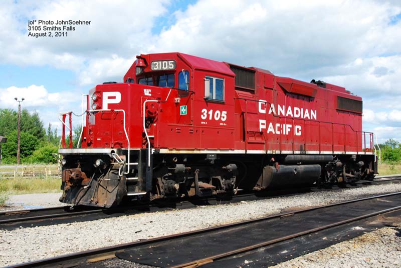 Other Photos (chronological) : 1. CP 3105 at Swift Current, SK., painted in the CP Rail Small Multimark paint scheme. Photo by Bill Sanderson, 2004; 2. CP 3105 at Smiths Falls, ON., painted in the Canadian Pacific paint scheme. Photo by John Soehner, 2010; 3. CP 3105 at Smiths Falls, ON., painted in the Canadian Pacific paint scheme. Photo by John Soehner, 2011; 4. CP 3105 at Port Coquitlam, B.C., painted in the Canadian Pacific paint scheme. Photo by Mark Forseille, 2018.
