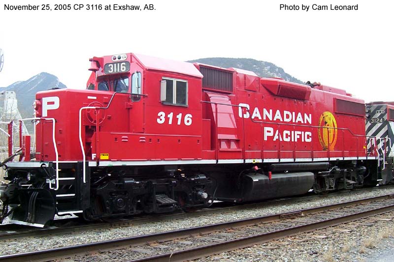 Other Photos (chronological) : 1. CP 3116 at North Bay, ON., painted in the CP Rail Small Multimark paint scheme. Photo by Bill Sanderson, 1990; 2. CP 3116 at Medicine Hat, AB., painted in the CPR Beaver paint scheme. Photo by Bill Sanderson, 2010.