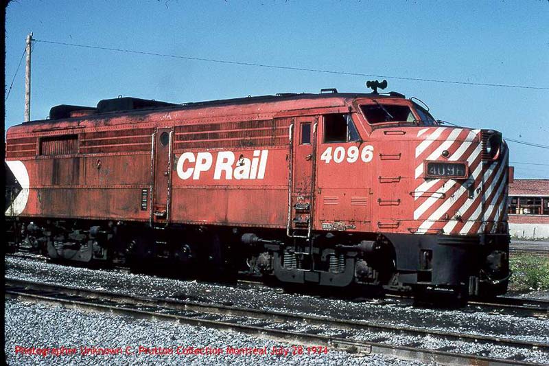 Built by : MLW Built in : 1953 Serial Number : 79172 Class : DFA-16f Paint Scheme : CP Rail Small Multimark This Photo : Claude Prutton collection, 1974