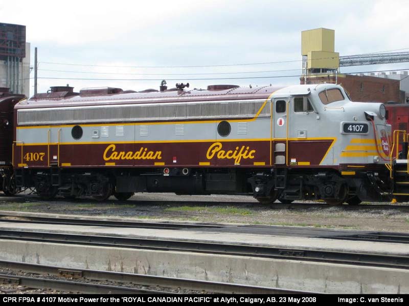 9. CP 4107 at Alyth, Calgary, AB., painted in the Maroon & Grey "Script" paint scheme. Photo by Cor van Steenis, 2008;
