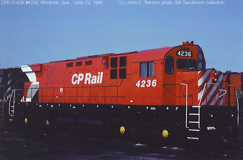 Other Photos (chronological) : 1. CP 4236 at Toronto, ON., painted in the Maroon & Grey "Script" paint scheme. Photo by Michael A. Tedesco, 1971. From the Bill Sanderson collection; 2. CP 4236 at Smiths Falls, ON., wrecked, painted in the CP Rail Large Multimark paint scheme. Photo by Bruce Chapman, 1979; 3. CP 4236 at Smiths Falls, ON., wrecked, painted in the CP Rail Large Multimark paint scheme. Photo by Bruce Chapman, 1979; 4. CP 4236 at Montreal, QC., painted in the CP Rail Large Multimark paint scheme. Photo by John C. Benson, 1980. From the Bill Sanderson collection; 5. CP 1100 at Ogden, Calgary AB., converted to Control Cab #1100, painted in the CP Rail no-Multimark paint scheme. Photo by Doug MacKenzie, 2006.