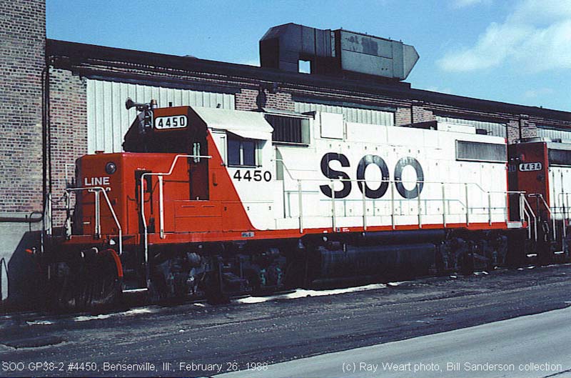 Other Photos (chronological) : 1. SOO 4450 at Bensenville, IL., painted in the SOO Red/White paint scheme. Photo by Ray Weart, 1988. From the Bill Sanderson collection.