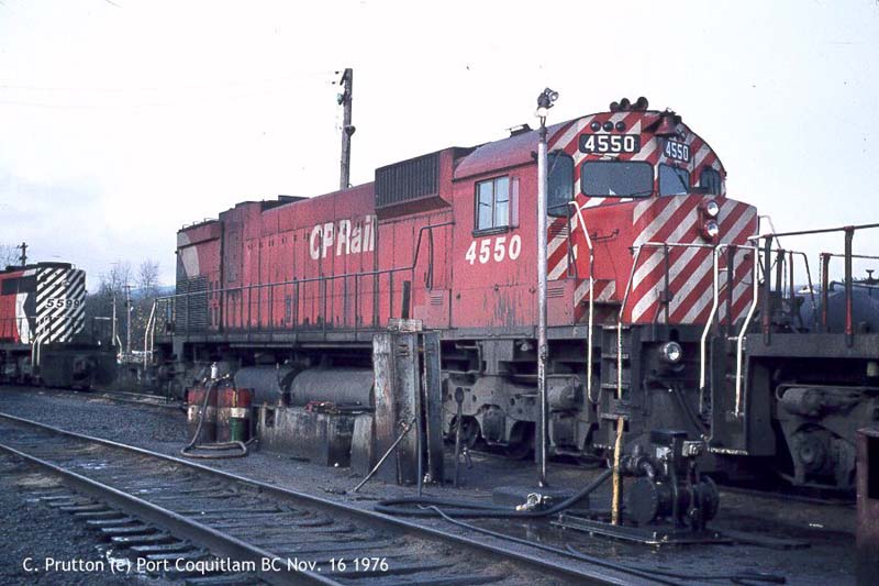 Other Photos (chronological) : 1. CP 4550 at Alyth, Calgary AB., painted in the CP Rail Large Multimark paint scheme. Photographer unknown, 1974. From the Bill Sanderson collection; 2. CP 4550 at Port Coquitlam, B.C., painted in the CP Rail Large Multimark paint scheme. Photo by Claude Prutton, 1976; 3. CP 4550 at Smiths Falls, ON., painted in the CP Rail Large Multimark paint scheme. Photo by Bill Sanderson, 1984.