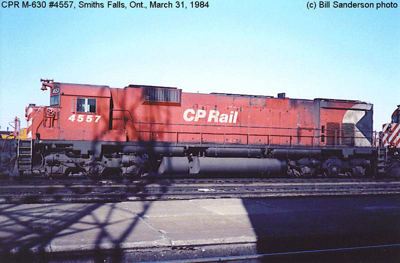 Other Photos (chronological) : 1. CP 4557 at Smiths Falls, ON., painted in the CP Rail Large Multimark paint scheme. Photo by Bill Sanderson, 1984.