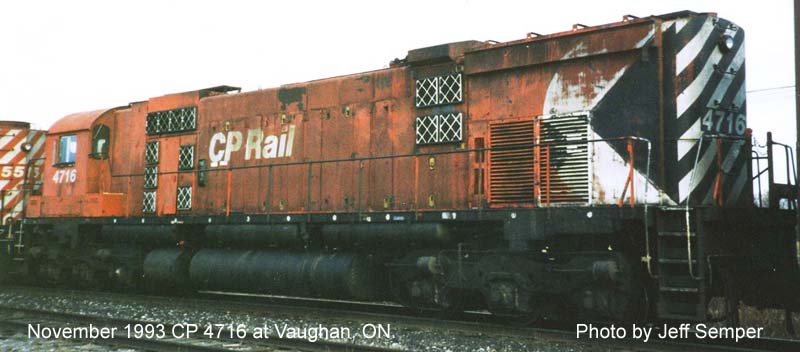 Other Photos (chronological) : 1. CP 4716 at Toronto, ON., painted in the CP Rail Large Multimark paint scheme. Photographer unknown, 1979. From the Bill Sanderson collection; 2. CP 4716 at Smiths Falls, ON., painted in the CP Rail Large Multimark paint scheme. Photo by Bill Sanderson, 1983; 3. CP 4716 at Vaughan, ON., painted in the CP Rail Large Multimark paint scheme. Photo by Jeff Semper, 1993; 4. CP 4716 at Vaughan, ON., painted in the CP Rail Large Multimark paint scheme. Photo by Jeff Semper, 1993.