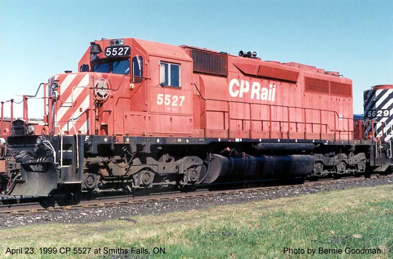 Other Photos (chronological) : 1. CP 5527 at Alyth, Calgary AB., painted in the Maroon & Grey "Script" paint scheme. Photo by Bob Loat, 1968. From the Bill Sanderson collection; 2. CP 5527 at Port Coquitlam, B.C., painted in the CP Rail Large Multimark paint scheme. Photo by Claude Prutton, 1977; 3. CP 5527 at Toronto, ON., painted in the CP Rail Small Multimark paint scheme. Photo by Bruce Chapman, 1982. From the Bill Sanderson collection; 4. CP 5527 at Port Coquitlam, B.C., painted in the CP Rail no-Multimark paint scheme. Photo by Mark Forseille, 1994; 5. GCFX 3084 at Smiths Falls, ON., painted White/Blue, lettered GCFX. Photo by Bill Sanderson, 2008.