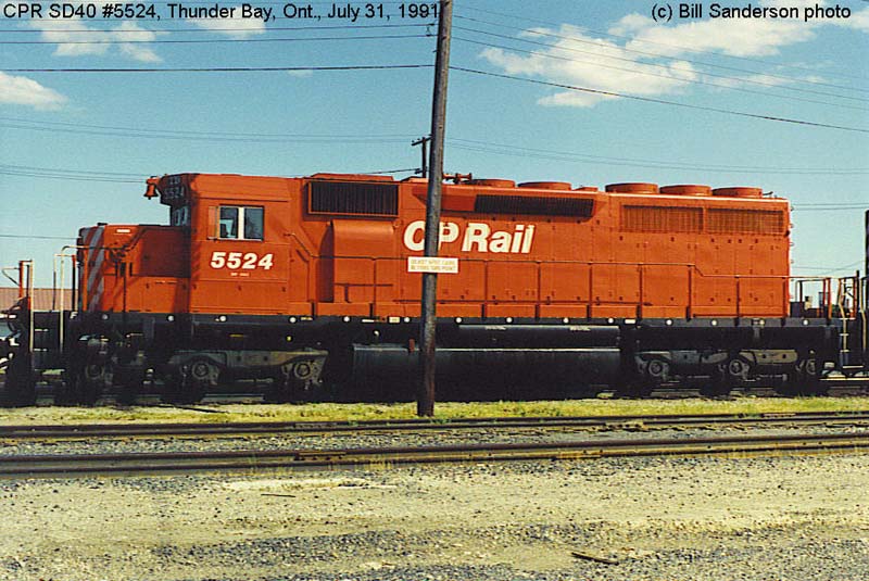 Other Photos (chronological) : 1. CP 5524 at London, ON., painted in the Maroon & Grey "Script" paint scheme. Photographer unknown, 1966. From the Bill Sanderson collection; 2. CP 5524 at Field B.C., painted in the CP Rail Large Multimark paint scheme. Photo by Bruce Chapman, 1972. From the Bill Sanderson collection; 2. CP 5524 at Windsor, ON., painted in the CP Rail Small Multimark paint scheme (experimental). Photo by Earl Minnis, 1975; 2. CP 5524 at Smiths Falls ON., painted in the CP Rail Small Multimark paint scheme. Photo by Bill Sanderson, 1984; 3. CP 5524 at Thunder Bay, ON., painted in the CP Rail no-Multimark paint scheme. Photo by Bill Sanderson, 1991; 4. CP 5524 at Port Coquitlam, B.C., painted in the CP Rail no-Multimark paint scheme. Photo by Mark Forseille, 1994.