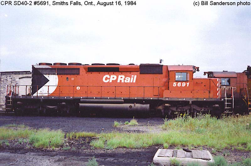 Other Photos (chronological) : 1. CP 5691 at Smiths Falls, ON., painted in the CP Rail Large Multimark paint scheme. Photo by Bill Sanderson, 1984.