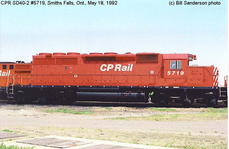 Other Photos (chronological) : 1. CP 5719 at Smiths Falls, ON., painted in the CP Rail Large Multimark paint scheme. Photo by Bill Sanderson, 1984; 2. CP 5719 at Alyth, Calgary AB., painted in the CP Rail Small Multimark paint scheme. Photo by P.A. Patenaude, 1986. From the Bill Sanderson collection; 3. CP 5719 at Smiths Falls, ON., painted in the CP Rail no-Multimark paint scheme. Photo by Bill Sanderson, 1992; 4. CP 5719 at Alyth, Calgary AB., painted in the CP Rail no-Multimark paint scheme, with carbody filters added to the long hood. Photo by Dale Winkler, 2003; 5. CP 5719 at Port Coquitlam, B.C., painted in the CP Rail no-Multimark paint scheme. Photo by Mark Forseille, 2008; 6. CP 5719 at WInnipeg, MB., painted in the CP Rail no-Multimark paint scheme. Photo by A. Ross Harrison, 2014; 7. CP 5719 at WInnipeg, MB., painted in the CP Rail no-Multimark paint scheme. Photo by A. Ross Harrison, 2015.