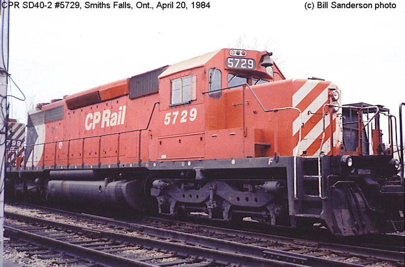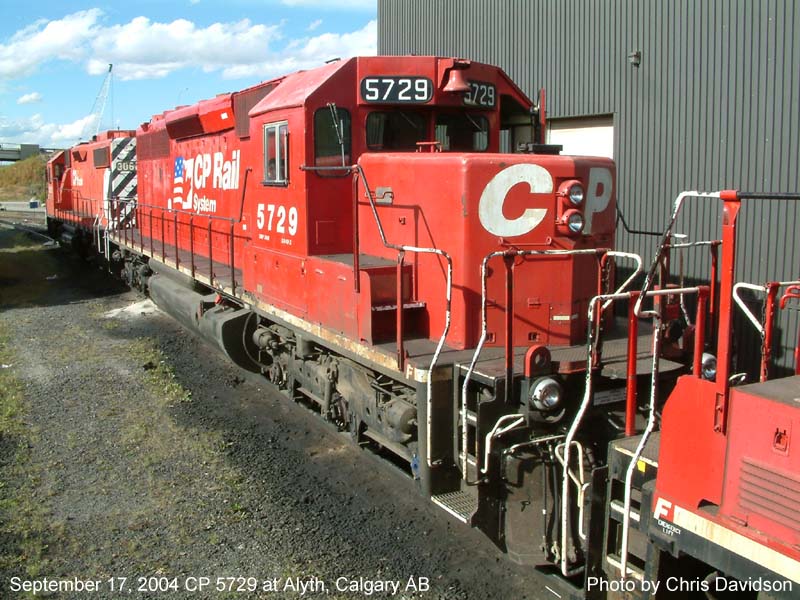 Other Photos (chronological) : 1. CP 5729 at Smiths Falls, ON., painted in the CP Rail Large Multimark paint scheme. Photo by Bill Sanderson, 1984; 2. CP 5729 at Smiths Falls, ON., painted in the CP Rail no-Multimark paint scheme. Photo by Bill Sanderson, 1991; 3. CP 5729 at Smiths Falls, ON., painted in the CP Rail Dual Flags paint scheme. Photo by Bill Sanderson, 1996; 4. CP 5729 at Alyth, Calgary AB., painted in the CP Rail Dual Flags paint scheme. Photo by Chris Davidson, 2004.