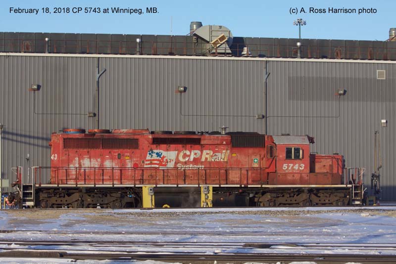 Other Photos (chronological) : 1. CP 5743 at Smiths Falls, ON., painted in the CP Rail Large Multimark paint scheme. Photo by Bill Sanderson, 1984; 2. CP 5743 at Tichborne, ON., wrecked, painted in the CP Rail Large Multimark paint scheme. Photo by Bruce Chapman, 1986. From the Bill Sanderson collection; 3. CP 5743 at Smiths Falls, ON., painted in the CP Rail no-Multimark paint scheme. Photo by Bill Sanderson, 1992; 4. CP 5743 at Winnipeg, MB., painted in the CP Rail Dual Flags paint scheme. Photo by A. Ross Harrison, 2010; 5. CP 5743 at Winnipeg, MB., painted in the CP Rail Dual Flags paint scheme. Photo by A. Ross Harrison, 2018.