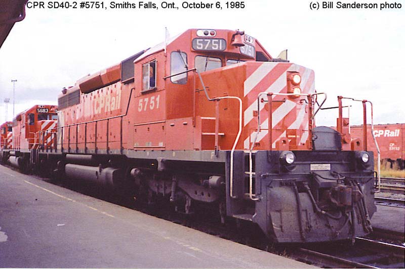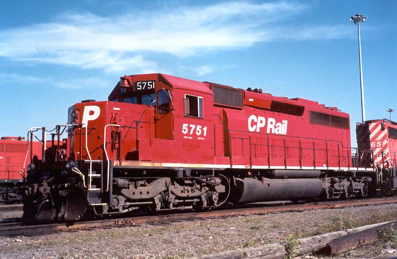 Other Photos (chronological) : 1. CP 5751 at Montreal, QC., painted in the CP Rail Large Multimark paint scheme. Photo by Bruce Chapman, 1977. From the Bill Sanderson collection; 2. CP 5751 at Smiths Falls, ON., painted in the CP Rail Small Multimark paint scheme. Photo by Bill Sanderson, 1985; 3. CP 5751 at Windsor, ON., painted in the CP Rail Small Multimark paint scheme. Photo by Earl Minnis, 1987; 4. CP 5751 at Ottawa, ON., painted in the CP Rail no-Multimark paint scheme. Photo by Ross Harrison, 1988. From the Bill Sanderson collection.