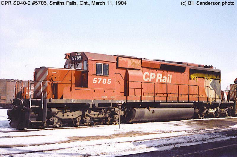 Other Photos (chronological) : 1. CP 5785 at Smiths Falls, ON., painted in the CP Rail Large Multimark paint scheme. Photo by Bill Sanderson, 1984; 2. CP 5393 at Smiths Falls, ON., painted red with basic CP decals. Photo by Bill Sanderson, 2001.