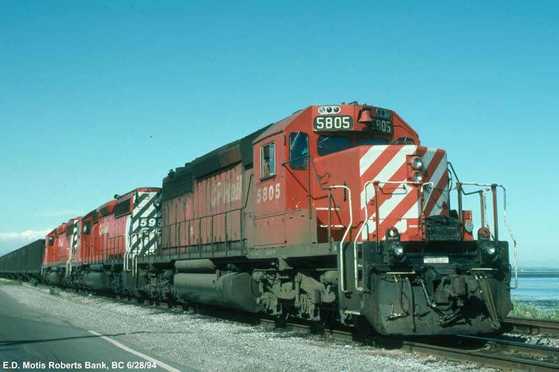 Other Photos (chronological) : 1. CP 5805 at Revelstoke, B.C., painted in the CP Rail Large Multimark paint scheme. Photo by Bruce Chapman, 1977. From the BIll Sanderson collection; 2. CP 5805 at Roberts Bank, B.C., painted in the CP Rail no-Multimark paint scheme. Photo by E.D. Motis, 1994; 3. CP 5805 at Smiths Falls, ON., painted in the CP Rail no-Multimark paint scheme. Photo by Bernie Goodman, 2000.