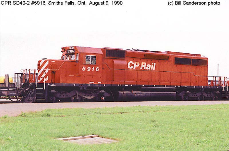 Other Photos (chronological) : 1. CP 5916 at Smiths Falls, ON., painted in the CP Rail Small Multimark paint scheme. Photo by Bill Sanderson, 1985; 2. CP 5916 at Smiths Falls, ON., painted in the CP Rail no-Multimark paint scheme. Photo by Bill Sanderson, 1990; 3. CP 5916 at Smiths Falls, ON., painted in the CP Rail Dual Flags paint scheme. Photo by Bill Sanderson, 1997.