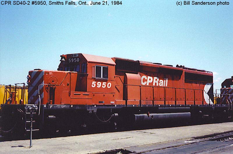 Other Photos (chronological) : 1. CP 5950 at Smiths Falls, ON., painted in the CP Rail Small Multimark paint scheme. Photo by Bill Sanderson, 1984; 2. CP 5950 at North Bend, B.C., painted in the CP Rail no-Multimark paint scheme. Photo by Bill Sanderson, 1993; 3. CP 5950 at Calgary AB., painted in the CP Rail Dual Flags paint scheme. Photo by Cor van Steenis, 2008.