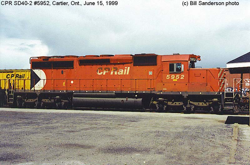 Other Photos (chronological) : 1. CP 5952 at Cartier, ON., painted in the CP Rail Small Multimark paint scheme. Photo by Bill Sanderson, 1999; 2. CP 5952 at Port Coquitlam, BC., painted in the CP Rail Small Multimark paint scheme. Photo by Mark Forseille, 2008.
