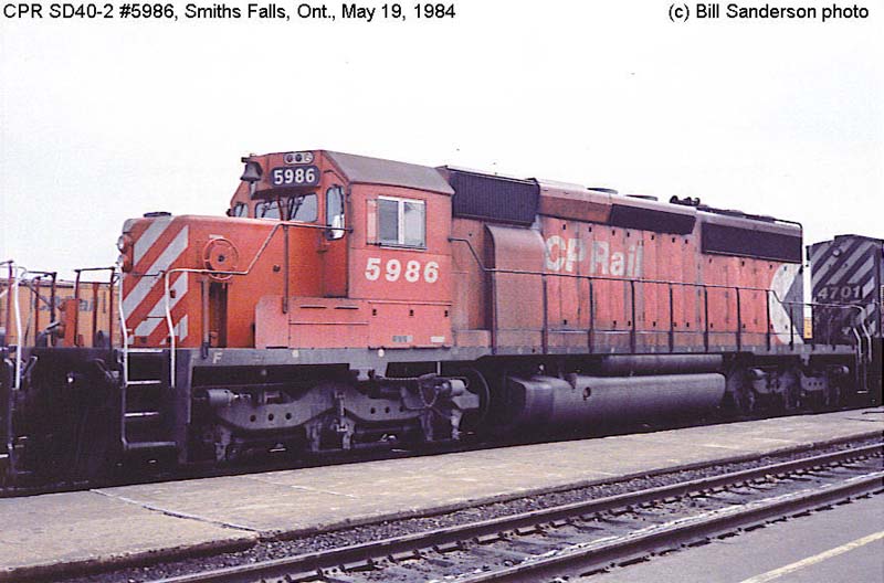 Other Photos (chronological) : 1. CP 5986 at Smiths Falls, ON., painted in the CP Rail Small Multimark paint scheme. Photo by Bill Sanderson, 1984.