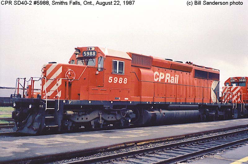 Other Photos (chronological) : 1. CP 5988 at Smiths Falls, ON., painted in the CP Rail Small Multimark paint scheme. Photo by Bill Sanderson, 1997; 2. CP 5988 at Winnipeg, MB., painted in the CP Rail Small Multimark paint scheme. Photo by A. Ross Harrison, 2008; 3. CP 5988 at Winnipeg, MB., painted in the CP Rail Small Multimark paint scheme. Photo by A. Ross Harrison, 2013.