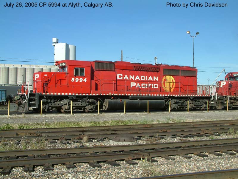 Other Photos (chronological) : 1. CP 5994 at Smiths Falls, ON., painted in the CP Rail Small Multimark paint scheme. Photo by Bill Sanderson, 1984; 2. CP 5994 at Smiths Falls, ON., painted in the CP Rail Dual Flags paint scheme. Photo by Bill Sanderson, 1994; 3. CP 5994 at Winnipeg, MB, painted in the CPR Beaver paint scheme. Photo by A. Ross Harrison, 2008; 4. CP 5994 at Alyth, Calgary AB., painted in the CPR Beaver paint scheme. Photo by Cor van Steenis, 2008; 5. CP 5994 at Port Coquitlam, B.C., painted in the CPR Beaver paint scheme. Photo by Mark Forseille, 2012; 6. CP 5994 at Winnipeg, MB., painted in the CPR Beaver paint scheme. Photo by A. Ross Harrison, 2019.