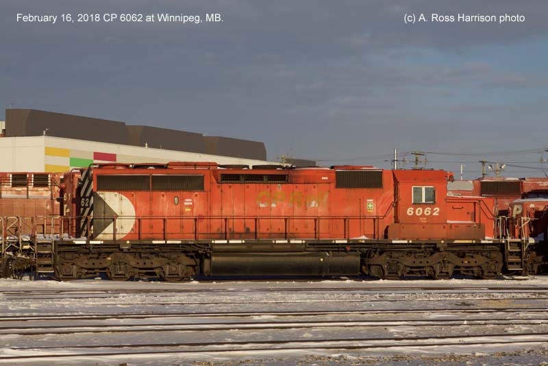 Other Photos (chronological) : 1. CP 6062 at Smiths Falls, ON., brand new, painted in the CP Rail Small Multimark paint scheme. Photo by Bill Sanderson, 1985; 2. CP 6062 at Smiths Falls, ON., re-equipped to lead, painted in the CP Rail Small Multimark paint scheme. Photo by Bill Sanderson, 1998; 3. CP 6062 at Port Coquitlam, B.C., painted in the CP Rail Small Multimark paint scheme. Photo by Mark Forseille, 2010; 4. CP 6062 at Winnipeg, MB., painted in the CP Rail Small Multimark paint scheme. Photo by A. Ross Harrison, 2018; 5. CP 6062 at Winnipeg, MB., painted in the CP Rail Small Multimark paint scheme. Photo by A. Ross Harrison, 2018; 6. CP 6062 at Winnipeg, MB., painted in the CP Rail Small Multimark paint scheme. Photo by A. Ross Harrison, 2018; 7. CP 6062 at WInnipeg, MB., painted in the CP Rail Small Multimark paint scheme. Photo by A. Ross Harrison, 2018; 8. CP 6062 at WInnipeg, MB., painted in the CP Rail Small Multimark paint scheme. Photo by A. Ross Harrison, 2018.