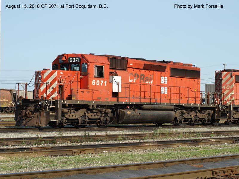 Other Photos (chronological) : 1. CP 5840 at Calgary AB., painted in the CP Rail Large Multimark paint scheme. Photo by E.D. Motis, 1978; 2. CP 6071 at Roberts Bank, B.C., painted in the CP Rail no-Multimark paint scheme. Photo by Claude Prutton, 1991; 3. CP 6071 at Cranbrook, B.C., painted in the CP Rail no-Multimark paint scheme. Photo by Wilco van Schoonhoven, 2006; 4. CP 6071 at Port Coquitlam, B.C., painted in the CP Rail no-Multimark paint scheme. Photo by Mark Forseille, 2010.