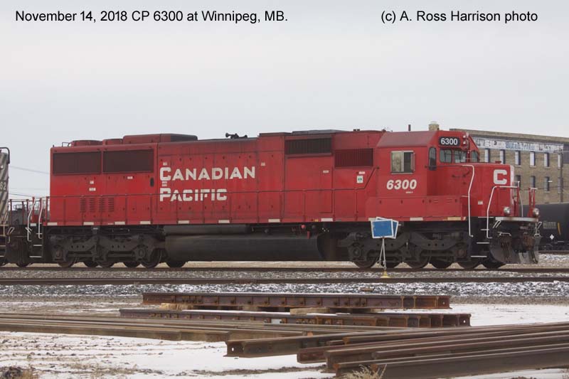 Other Photos (chronological) : 1. SOO 6033 at Regina, SK., painted in the SOO Red/White paint scheme. Photo by W. van Schoonhoven, 2003; 2. CP 6300 at Winnipeg, MB., painted in the Canadian Pacific paint scheme. Photo by A. Ross Harrison, 2018; 3. CP 6300 at Winnipeg, MB., painted in the Canadian Pacific paint scheme. Photo by A. Ross Harrison, 2019.