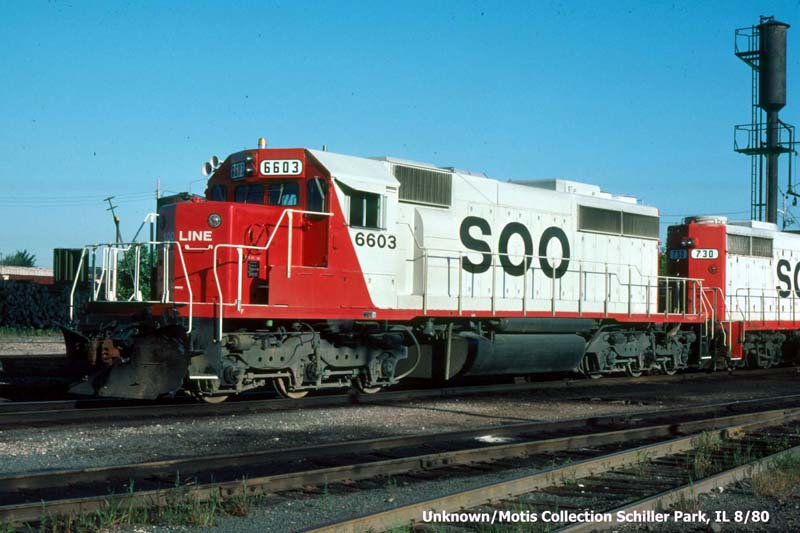 Other Photos (chronological) : 1. SOO 6603 at Schiller Park, IL., painted in the SOO Red/White paint scheme. Photo from the E.D. Motis collection, 1980; 2. SOO 6603 at Bensenville, IL., painted in the SOO Red/White paint scheme. Photo by F. Novak, 1993. From the E.D. Motis collection; 3. CP 6603 at Moose Jaw, SK., painted in the CP Rail Dual Flags paint scheme. Photo by Wilco van Schoonhoven, 2003; 4. CP 6603 at Alyth, Calgary AB., painted in the Canadian Pacific paint scheme. Photo by Cor van Steenis, 2008; 5. CP 6603 at Winnipeg, MB., painted in the Canadian Pacific paint scheme. Photo by A. Ross Harrison, 2014.