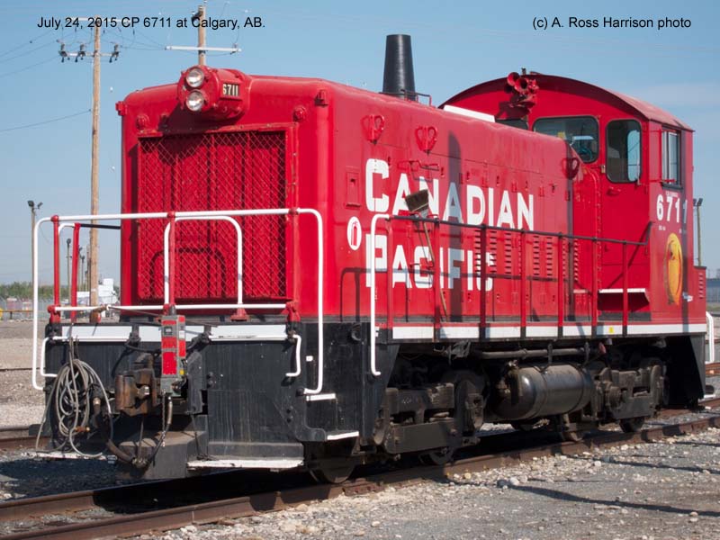 Other Photos (chronological) : 1. CP 6711 at Edmonton, AB., painted in the CP Rail Multimark paint scheme. Photo by Lee Labreque, 1982. From the Ron Visockis collection; 2. CP 6711 at Ogden, Calgary AB., painted in the CP Rail no-Multimark paint scheme. Photo by Tom Newton, 1997. From the Bill Sanderson collection; 3. CP 6711 at Ogden, Calgary AB., painted in the CPR Beaver paint scheme. Photo by Dale Winkler, 2003; 4. CP 6711 at Ogden, Calgary, AB., painted in the CPR Beaver paint scheme. Photo by Cor van Steenis, 2008; 5. CP 6711 at Ogden, Calgary, AB., painted in the CPR Beaver paint scheme. Photo by Doug MacKenzie, 2011; 6. CP 6711 at Calgary AB, painted in the CPR Beaver paint scheme. Photo by A. Ross Harrison, 2015.