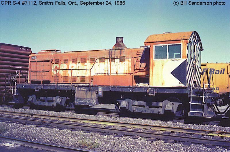 Other Photos (chronological) : 1. CP 7112 at Vancouver, B.C., painted in the Maroon & Grey "Block" paint scheme. Photographer and date unknown. From the Bill Sanderson collection; 2. CP 7112 at Smiths Falls, ON., painted in the CP Rail Multimark paint scheme. Photo by Bill Sanderson, 1986.