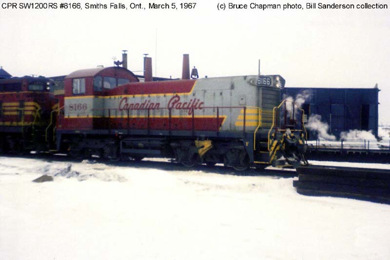 Other Photos (chronological) : 1. CP 8166 at Smiths Falls, ON., painted in the Maroon & Grey "Script" paint scheme. Photo by Bruce Chapman, 1967. From the Bill Sanderson collection; 2. CP 8166 at Alyth, Calgary AB., painted in the CP Rail Multimark paint scheme. Photo by R.A. Matthews, 1979. From the Bill Sanderson collection.