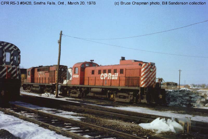 Other Photos (chronological) : 1. CP 8428 at Toronto, ON., painted in the Maroon & Grey "Block" paint scheme. Photo by D.W. Hately, 1966. From the Bill Sanderson collection; 2. CP 8428 at Montreal, QC., painted in the CP Rail Large Multimark paint scheme. Photo by Jean Patenaude, 1975. From the Bill Sanderson collection; 3. CP 8428 at Smiths Falls, ON., painted in the CP Rail Large Multimark paint scheme. Photo by Bruce Chapman, 1978. From the Bill Sanderson collection.