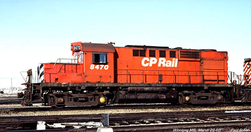 Other Photos (chronological) : 1. CP 8470 at Smiths Falls, ON., painted in the Maroon & Grey "Block" paint scheme. Photo by Bruce Chapman, 1965. From the Bill Sanderson collection; 2. CP 8470 at Montreal, QC., painted in the CP Rail Large Multimark paint scheme. Photo by P.A. Patenaude, 1975. From the Bill Sanderson collection; 3. CP 8470 at Winnipeg, MB., chop-nosed, painted in the CP Rail Multimark paint scheme, without Multimark logo. Photo by R.A. Matthews, 1980. From the Ron Visockis collection; 4. CP 8470 at Winnipeg, MB., chop-nosed, painted in the CP Rail Multimark paint scheme, without Multimark logo. Photo by Paul Smith, 1980. From the Ron Visockis collection; 5. CP 8470 at Montreal, QC., chop-nosed, painted in the CP Rail Multimark paint scheme, without Multimark logo. Photo by Ron Visockis, 1982.