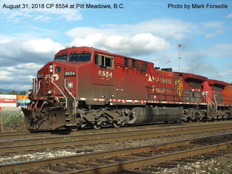 Other Photos (chronological) : 1. CP 8554 at Pitt Meadows, B.C., painted in the CPR Beaver paint scheme. Photo by Mark Forseille, 2018.