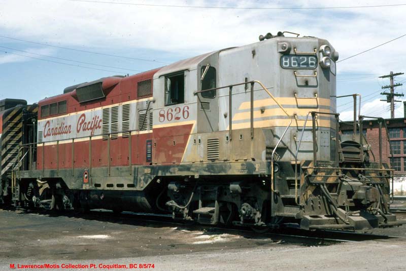 Other Photos (chronological) : 1. CP 8626 at Revelstoke, B.C., painted in the Maroon & Grey "Block" paint scheme. Photo by Bob Loat, 1964. From the Bill Sanderson collection; 2. CP 8626 at Regina, SK., painted in the CP Rail Small Multimark paint scheme (experimental). Photo by George Horna, 1976. From the Bill Sanderson collection; 3. CP 8626 at Edmonton, AB., painted in the CP Rail Small Multimark paint scheme. Photo by P.A. Patenaude, 1986. From the Bill Sanderson collection; 4. CP 1635 at Alyth, Calgary, AB., painted in the CP Rail paint scheme. Photo by Bill Sanderson, 1998.