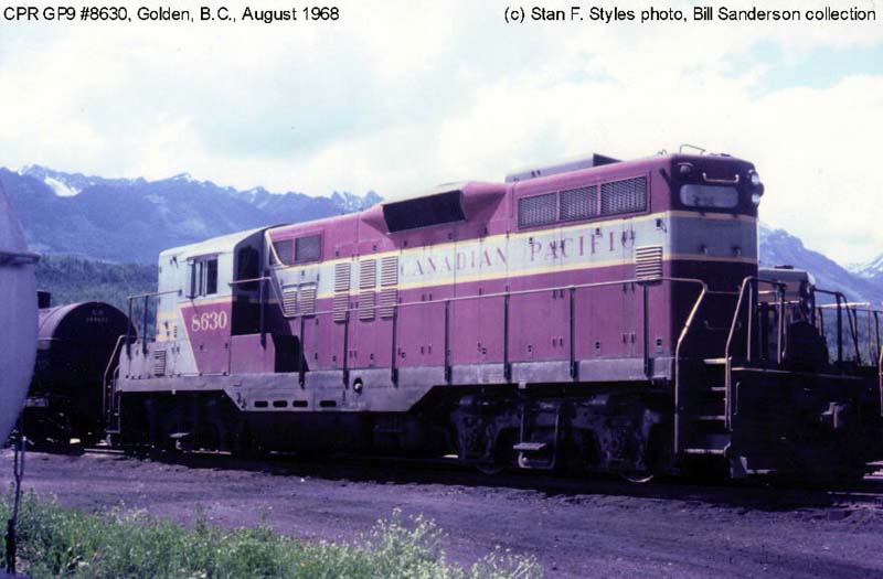 Other Photos (chronological) : 1. CP 8630 at Golden, B.C., painted in the Maroon & Grey "Block" paint scheme. Photo by Stan F. Styles, 1968. From the Bill Sanderson collection; 2. CP 8630 at Port Coquitlam, B.C., painted in the Maroon & Grey "Script" paint scheme. Photo by Robert L. Eastwood, 1971. From the Bill Sanderson collection; 3. CP 8630 at Red Deer, AB., painted in the CP Rail Large Multimark paint scheme. Photo by Richard Yaremko, 1978. From the Bill Sanderson collection; 4. CP 8630 at Montreal, QC., painted in the CP Rail Small Multimark paint scheme. Photo by Ross Harrison, 1988. From the Bill Sanderson collection; 4. CP 8214 at Beachville, ON., painted in the CP Rail no-Multimark paint scheme. Photo by Cam Leonard, 2004.