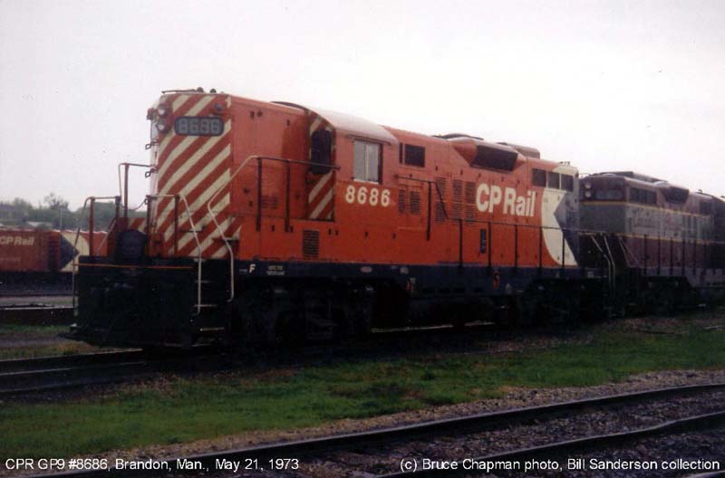 Other Photos (chronological) : 1. CP 8686 at Winnipeg, MB., painted in the Maroon & Grey "Script" paint scheme. Photo by Bill Dechau, 1972. From the Bill Sanderson collection; 2. CP 8686 at Brandon, MB., painted in the CP Rail Large Multimark paint scheme. Photo by Bruce Chapman, 1973. From the Bill Sanderson collection; 3. CP 8686 at Montreal, QC., being rebuilt to GP9u #8228. Photo by Ross Harrison, 1989. From the Bill Sanderson collection; 4. CP 8228 at Smiths Falls, ON., painted in the CP Rail no-Multimark paint scheme. Photo by Bill Sanderson, 1990.