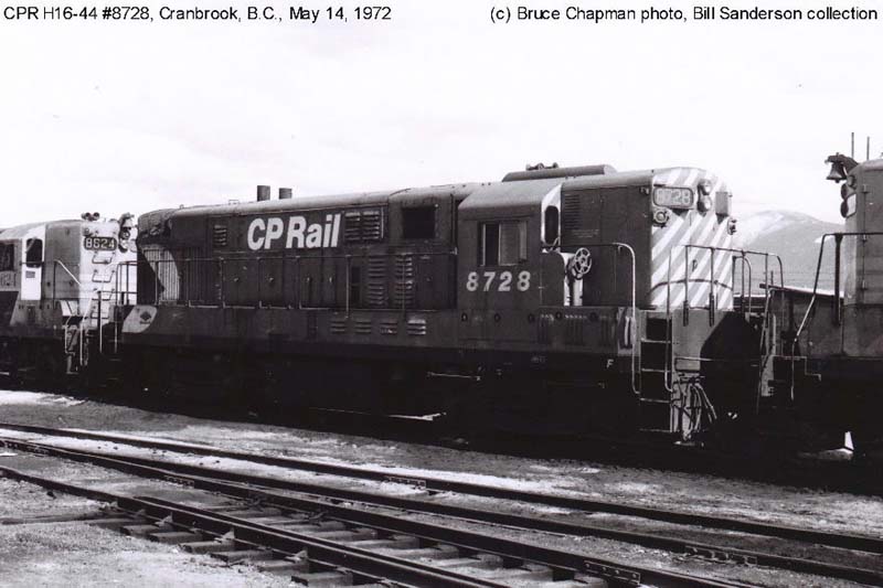 2. CP 8728 at Cranbrook, B.C., painted in the CP Rail Small Multimark paint scheme. Photo by Bruce Chapman, 1972. From the Bill Sanderson collection.