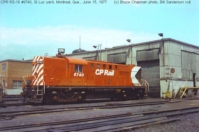Other Photos (chronological) : 1. CP 8740 at Ottawa, ON., painted in the Maroon & Grey "Block" paint scheme. Photo by Bruce Chapman, 1966. From the Bill Sanderson collection; 2. CP 8740 at Montreal, QC., painted in the CP Rail Large Multimark paint scheme. Photo by Jean Patenaude, 1975. From the Bill Sanderson collection; 3. CP 1804 at Farnham, QC., painted in the CP Rail Large Multimark paint scheme. Photo by F. Dubois, 1980. From the Bill Sanderson collection.