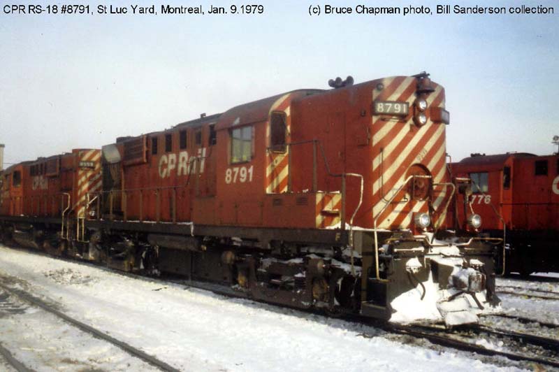 Other Photos (chronological) : 1. CP 8791 at Montreal, QC., painted in the CP Rail Large Multimark paint scheme. Photo by Bruce Chapman, 1979. From the Bill Sanderson collection; 2. CP 8791 at Montreal, QC., painted in the CP Rail Large Multimark paint scheme. Photo by Bruce Chapman, 1981. From the Bill Sanderson collection; 3. CP 1824 at Smiths Falls, ON., painted in the CP Rail Large Multimark paint scheme. Photo by Bill Sanderson, 1984.