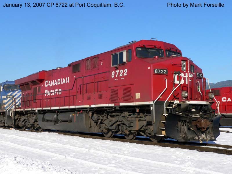 Other Photos (chronological) : 1. CP 8722 at Golden, B.C., painted in the Canadian Pacific paint scheme. Photo by Mark Johnson, 2006; 2. CP 8722 at Golden, B.C., rear side, painted in the Canadian Pacific paint scheme. Photo by Mark Johnson, 2006; 3. CP 8722 at Port Coquitlam, B.C., painted in the Canadian Pacific paint scheme. Photo by Mark Forseille, 2007.