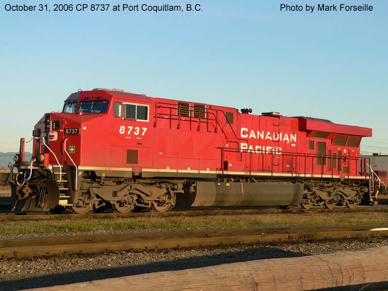 Other Photos (chronological) : 1. CP 8737 at Port Coquitlam, B.C., painted in the Canadian Pacific paint scheme. Photo by Mark Forseille, 2006; 2. CP 8737 at Winnipeg, MB., painted in the Canadian Pacific paint scheme. Photo by A. Ross Harrison, 2011; 3. CP 8737 at Winnipeg, MB., painted in the Canadian Pacific paint scheme. Photo by A. Ross Harrison, 2013.