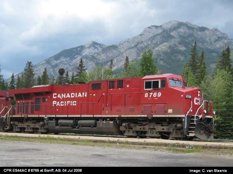 Other Photos (chronological) : 1. CP 8769 at Banff, AB., painted in the Canadian Pacific paint scheme. Photo by Cor van Steenis, 2008; 2. CP 8769 at Port Coquitlam, B.C., painted in the Canadian Pacific paint scheme. Photo by Mark Forseille, 2009.