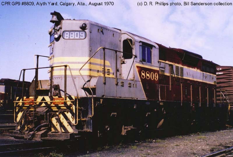 Other Photos (chronological) : 1. CP 8809 at Alyth, Calgary AB., painted in the Maroon & Grey "Block" paint scheme. Photo by D.R. Phillips, 1970. From the Bill Sanderson collection; 2. CP 8809 at Winnipeg, MB., painted in the CP Rail Large Multimark paint scheme. Photo by Bruce Chapman, 1973. From the Bill Sanderson collection; 3. CP 8809 at Alyth, Calgary AB., painted in the CP Rail Small Multimark paint scheme. Photo by P.A. Patenaude, 1986. From the Bill Sanderson collection; 4. CP 8234 at Beachville, ON., painted in the CP Rail no-Multimark paint scheme. Photo by Cam Leonard, 2004.