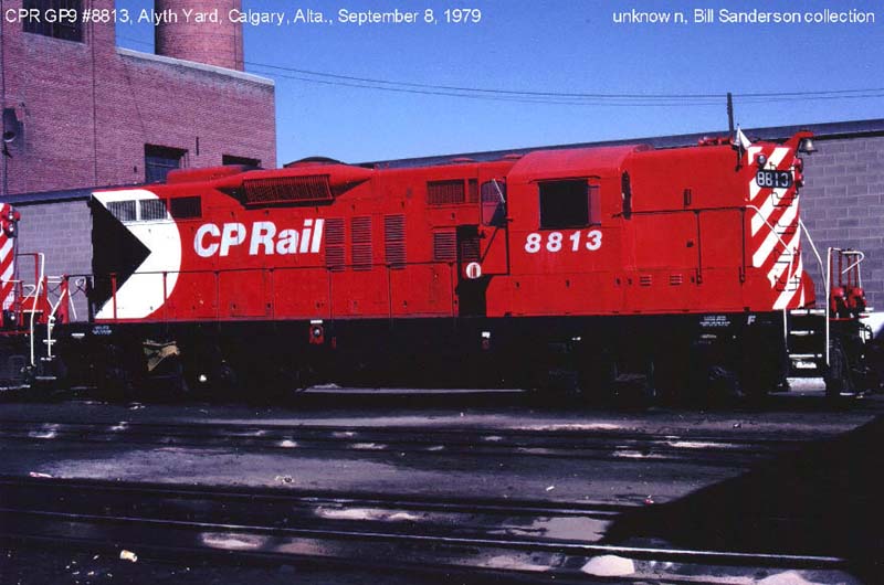 Other Photos (chronological) : 1. CP 8813 at Smiths Falls, ON., painted in the CP Rail Large Multimark paint scheme. Photo by Bruce Chapman, 1976. From the Bill Sanderson collection; 2. CP 8813 at Alyth, Calgary AB., painted in the CP Rail Large Multimark paint scheme. Photographer unknown, 1979. From the Bill Sanderson collection; 3. CP 8813 at Saskatoon, SK., painted in the CP Rail Small Multimark paint scheme. Photo by R. J. Gallagher, 1984. From the Bill Sanderson collection; 4. CP 1627 at Port Coquitlam, B.C., painted in the Canadian Pacific paint scheme. Photo by Mark Forseille, 2008.