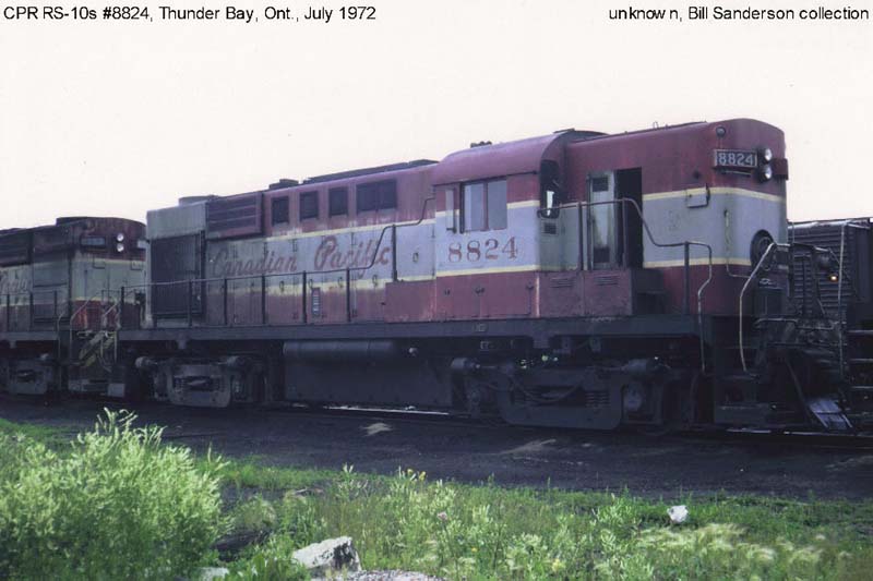 Other Photos (chronological) : 1. CP 8824 at Smiths Falls, ON., painted in the Maroon & Grey "Block" paint scheme. Photo by Bruce Chapman, 1965. from the Bill Sanderson collection; 2. CP 8824 at Ottawa, ON., painted in the Maroon & Grey "Script" paint scheme. Photo by Bruce Chapman, 1967. From the Bill Sanderson collection; 3. CP 8824 at Thunder Bay, ON., painted in the Maroon & Grey "Script" paint scheme. Photographer unknown, 1972. From the Bill Sanerson collection; 4. CP 8824 at Thunder Bay, ON., painted in the CP Rail Large Mutimark paint scheme. Photo by Bryan Martyniuk, 1980.