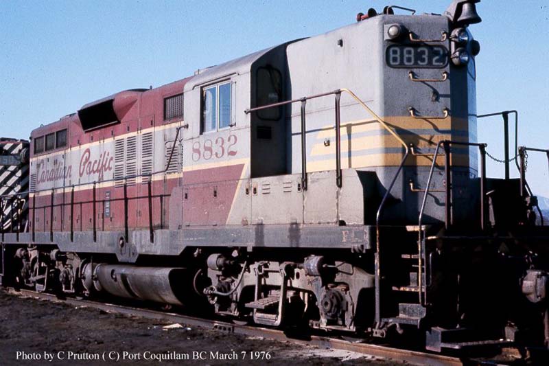 Other Photos (chronological) : 1. CP 8832 at Kamloops, B.C., painted in the Maroon & Grey "Block" paint scheme. Photo by Bob Loat, 1967. From the Bill Sanderson collection; 2. CP 8832 at Port Coquitlam, B.C., painted in the CP Rail Large Multimark paint scheme. Photo by Claude Prutton, 1976; 3. CP 1691 at Moose Jaw, SK., painted in the CP Rail no-Multimark paint scheme. Photo by Bill Sanderson, 1998.